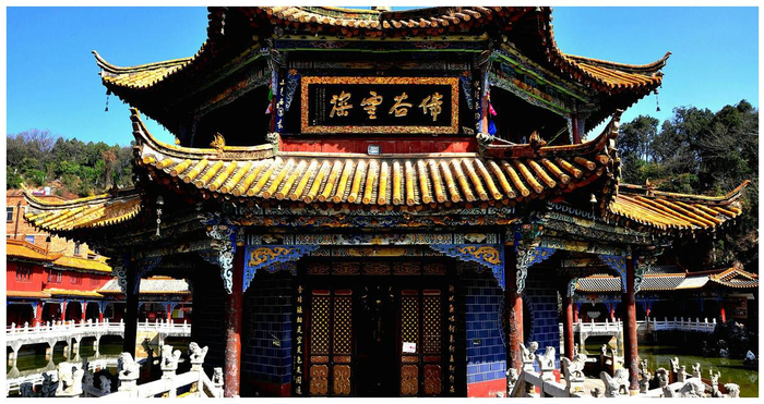因为观音又称为“圆通大士”,所以这里也是观音道场,而在大殿后方的四塑像,则是三菩萨像,分别为观世音菩萨像、文殊菩萨像、普贤菩萨像。正中间的观世音菩萨像是成男菩萨像,这也是云南省唯一的男性观音像。而圆通寺其实比浙江普陀山的观音道场还要早100多年,可以说是我国最早的观音寺了。