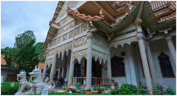 而沿着坡往下,便可看见一处牌坊,上书“圆通胜境”四字,据说这是清代吴三桂建造的,牌坊前面便是前厅,厅内宽敞无比,供奉着释迦太子说法像,是用纯铜浇铸而成,有2米高。穿过前厅的回廊,有一水池,池水中间是康熙年间建造的八角亭,亭内供奉的是千手观音,四周的石廊上还雕刻着数百对大小不一的石狮,工艺精湛,南北两处用石桥相互连接。