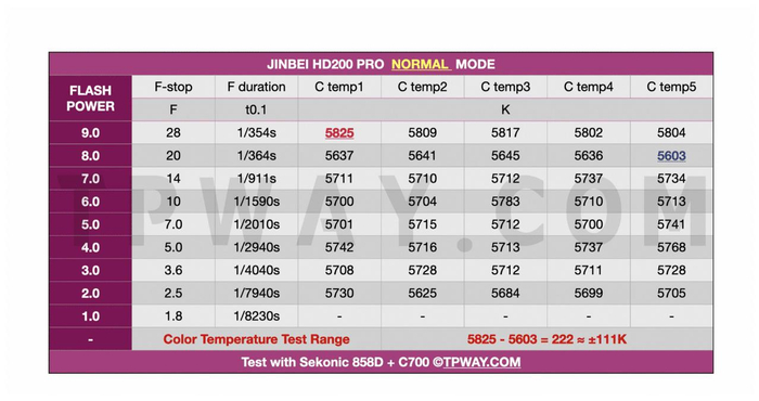 NOR(标准)FRE(高闪持凝固)HSS(高速同步)三个模式我们分别进行了测试,NOR普通模式最高一次色温5825K出现在全功率,最低一次5603K出现在8.0也就是1/2功率,从7.0-2.0色温水准浮动在约正负50K,算上全部功率为正负111K,闪光持续时间从1/354s到1/8230s,其实与其叫NOR普通模式,还不如改为COL色温恒定模式。