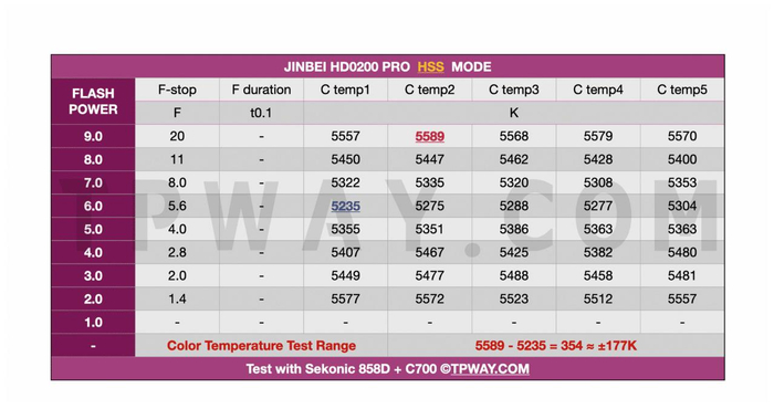 HSS模式,金贝的这个高速同步模式比较有意思,不需要相机触发引闪器就可以给出信号,刚好用世光858D的HSS模式测试一下,最高色温5589K出现在全功率,最低色温5235K出现在6.0也就是1/8功率。整体色温浮动正负177K。