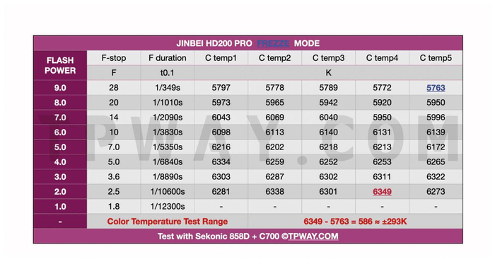 FRE凝固模式,即高闪持模式,最高色温6349K出现在2.0功率,最低5763K出现在全功率,整体色温浮动正负293K,闪持从1/349s到1/12300s闪持时间大大缩短,对于凝固型拍摄提升肉眼可见。