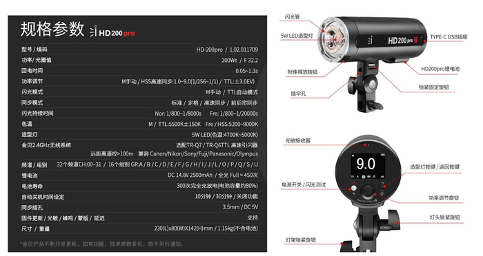 我们再来看看这次金贝这只HD200-pro都给了什么?200Ws的最大功率,5W LED造型灯,欧米伽型专业闪光灯管,2500mAh锂电池可提供不低于450次的全功率输出,普通模式/凝固模式/高速同步任意切换,配合金贝TR-Q7复合式热靴引闪器一个系统兼容佳能/尼康/索尼/富士/松下/奥巴六个品牌,另外除了锂电池供电以外还可以将电池替换为专用交流电源模块,变身为永不断电的影室闪光灯。