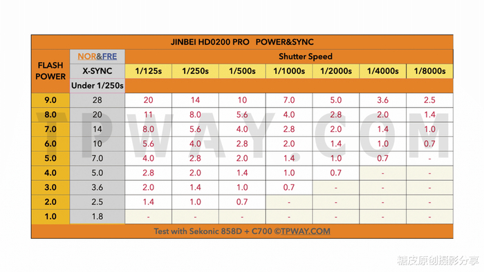 闪光持续时间在这个模式下就不用考虑了,高速同步下闪光灯相当于一个长亮光。即便你感觉我测得的功率光圈数值跟普通模式还有凝固模式差不了太多,但您别忘了这仅仅是1/125s,当你把相机的快门速度提高以后每提高一档快门速度,这个光圈数值需要增加一档。