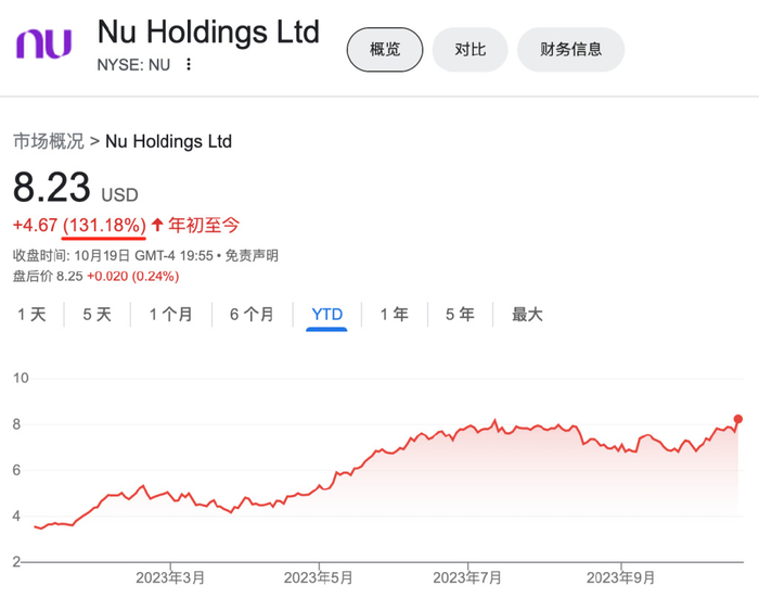 Nubank 此举获得了巨大的成功,股票价格在 2023 年上涨了 130% 以上,巴老爷子也因为持有Nubank 股票而大赚一笔。