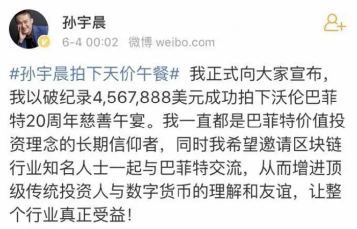 2019年 6月4日,1990年出生的波场(TRON)创始人孙宇晨在微博宣布,以3153万元的天价拍下了巴菲特慈善午餐,并邀请区块链行业知名人士一起与巴菲特交流。