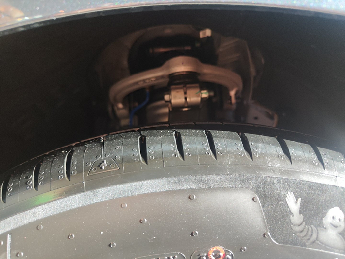 然后看后悬架,后悬架的下支臂是铝合金,亮闪闪这个,当然我们只能肉眼辨别,如果刚才喷了漆那就另说了,应该不是。其次,平衡杆吊杆也是黑色,副车架应该也是钢制。用料实际上代表着一定的价格导向,所以D19的底盘用料虽然中规中矩,价格上也就不会太尴尬。