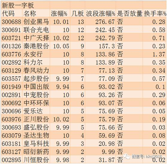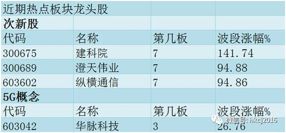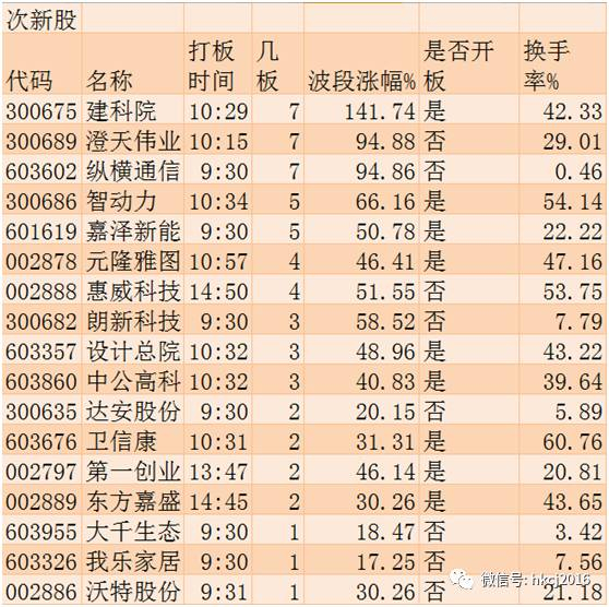 上涨情况:虽然次新股龙头中科信息特停了两个交易日,但是次新股的热度不减,澄天伟业、纵横通信、建科院成为了新龙头。