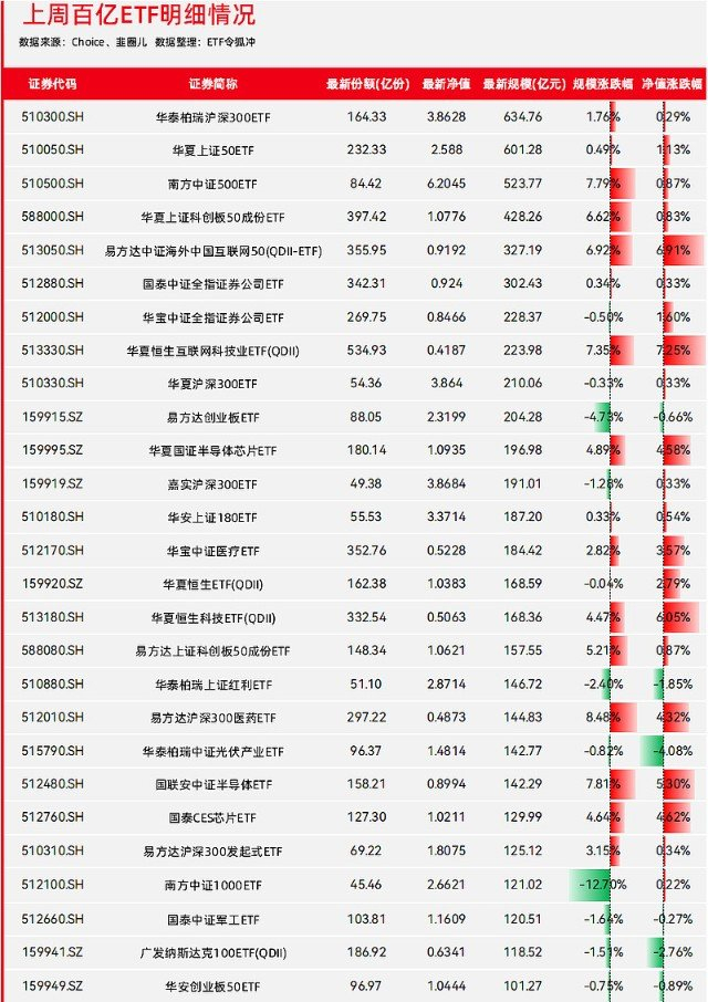 上周,百亿基金净值涨多跌少,几只投资港股的ETF产品净值表现依旧喜人。