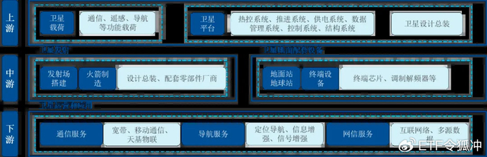 上游是卫星制造,涉及平台搭建、载荷制造、核心部件;中游是卫星发射和地面设备,涉及火箭制造和发射、终端芯片、接收器;下游是运营应用,涉及通信服务、导航服务、网信服务。