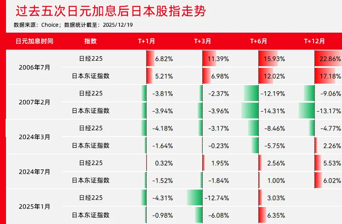 首先,从过去五次日元加息后的股指走势来看,加息后3个月,股指走低概率较高。