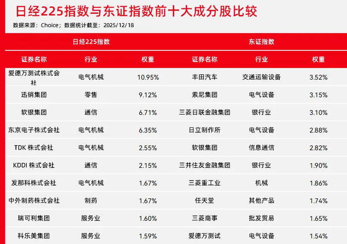 从两支指数前十大成分股来看,日经225指数的主要成分股不乏科技、消费等受利率波动比较明显的行业,加息会直接推高这类企业融资成本,同时压制下游需求,加息对指数有明显利空。爱德万在指数中占比超10%,个股波动会对指数表现有比较明显的影响。