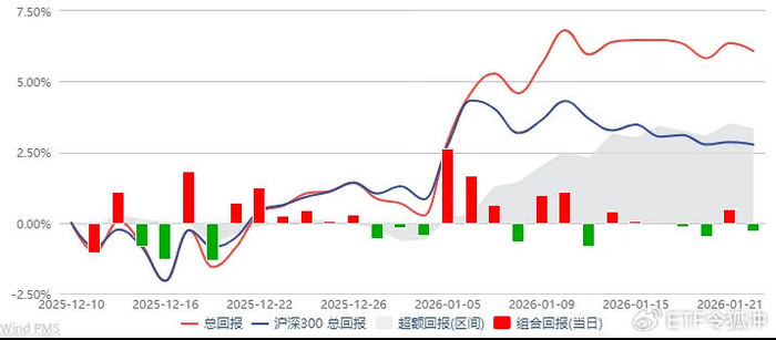 不过,借助Wind的组合分析,我发现二刀流组合在这波回调里表现得相当淡定。沪深300指数跌超1.5%,咱们的组合回撤却小一半多,账户净值曲线依然比较平稳。