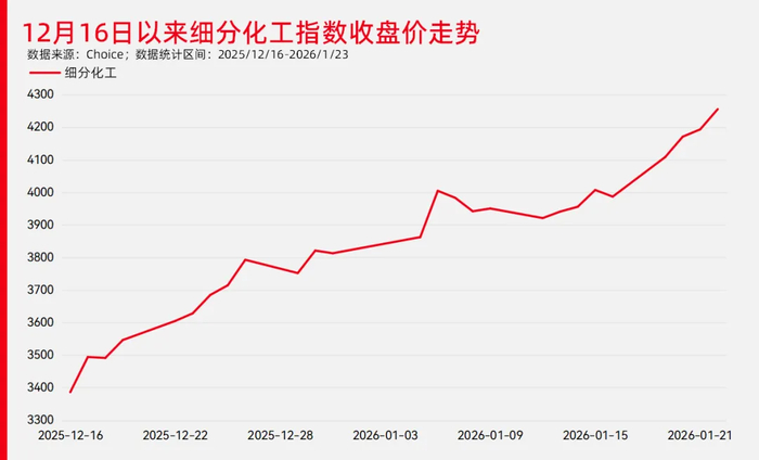 最近化工板块涨势如潮。12月16日以来,在不到六周时间内,细分化工指数(000813)收盘价就从不到3400点一路飙升至4200点上方,区间累计涨幅达到26.7%。