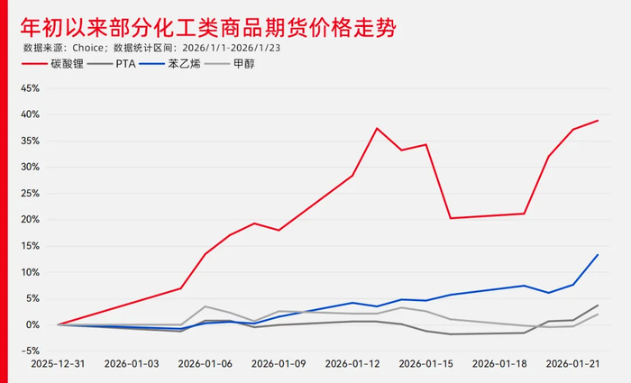 不仅是股市上化工产品表现优异,商品期货市场上,多个化工领域品种也在今年强势上涨。开年以来,碳酸锂期货价格大涨近40%,苯乙烯价格涨13%,PTA和甲醇等重要品种主力合约也温和上涨超2%。