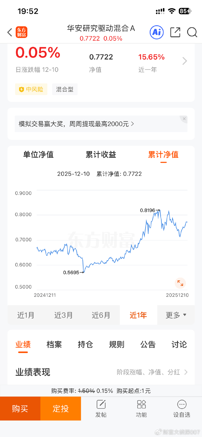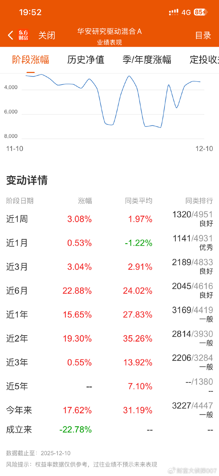 今天来分享的这只产品是——华安研究驱动A(011663),这是华安基金经理万建军管理的产品。这只基金成立时间超过4年,目前来看,成立以来业绩涨了-22.78%,目前累计净值0.7722元,成立以来业绩真的太惨了吧。这只基金在上一轮牛市中期成立的,当时市场大爆发,很多产品都表现得很好,加上到处都是明星基金经理,瞬间全市场眼花缭乱,很多基民追捧,后来市场大跌,直接跌懵了,多年不回本,就像这只产品一样。所以份额规模大减,一片怒骂声!