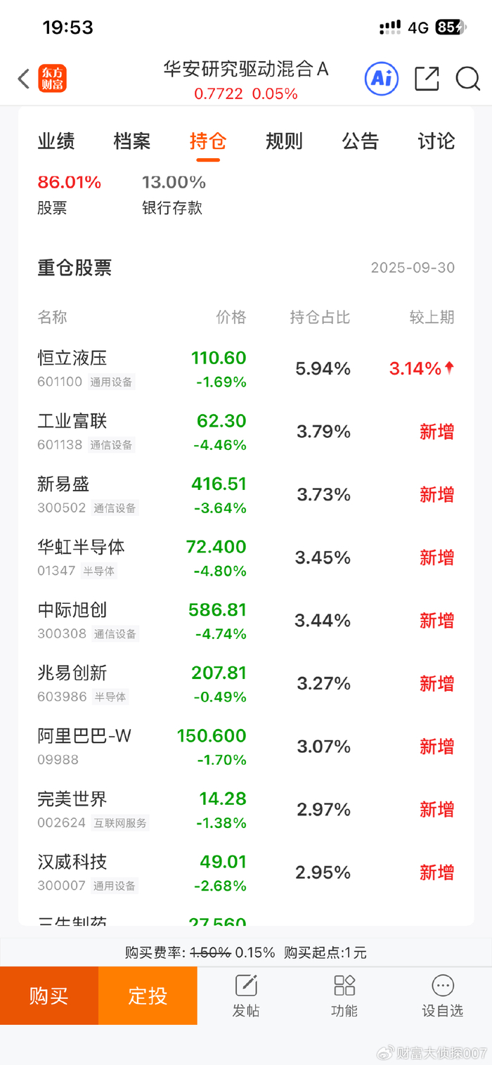 我们来看看2025年3季度末这个基金的持仓情况,主要持有的股票有:恒立液压、工业富联、新易盛、华虹半导体、中际旭创、兆易创新和阿里巴巴等。感觉他终于往半导体互联网科技方向走了。