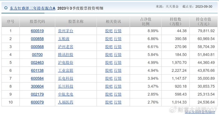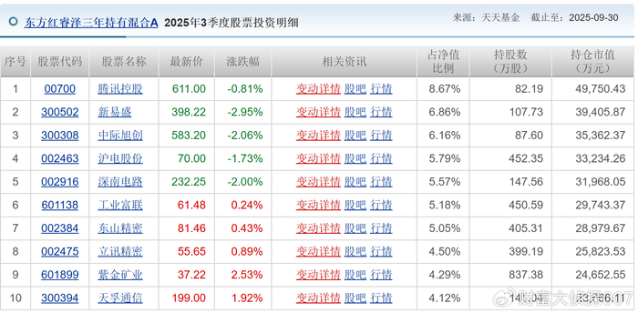 人才断层直接导致投资风格变形。为填补人才空缺,东方红资管引入外部投研力量,但部分基金经理的持仓风格呈现大幅漂移。以从广发基金引进的苗宇为例,天天基金数据显示,其管理产品的持仓从2023年三季度集中持有茅台、五粮液、泸州老窖等白酒股,到2025年一季度全面切换至腾讯、阿里、美团等港股互联网标的,2025年三季度又转向新易盛、中际旭创等光模块企业,赛道切换频繁,与东方红资管传统的“深度价值”投资风格相去甚远。