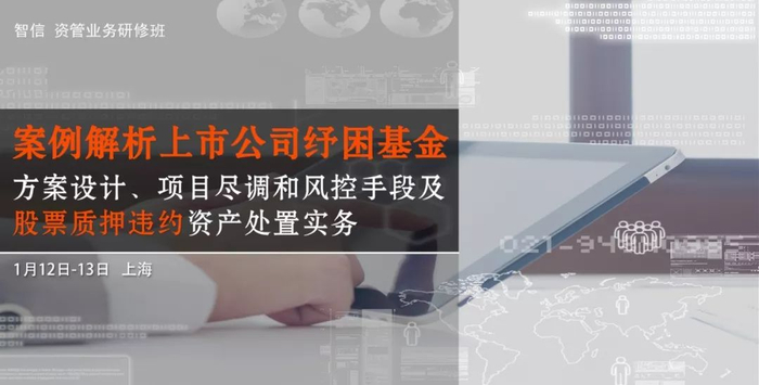 鉴于此,1月12日-13日(周六、日)智信在上海举行的主题为“案例解析上市公司纾困基金方案设计、项目尽调和风控手段及股票质押违约资产处置实务”的资管业务研修班。
