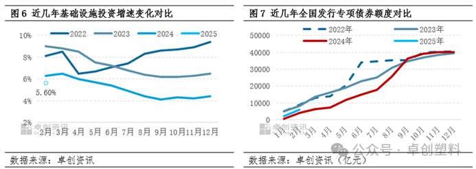 地方债券在基础设施建设中的融资作用及其对经济发展中具有推动作用。通过发行地方债券,地方政府能够筹集到大量资金,用于基础设施建设。就2025年1-2月份地方债券及基础设施投资建设来看,1—2月份,全国发行地方政府新增债券发行额度较24年继续处于稳定增长态势,全国发行地方政府债券8019亿元,其中一般债券2051亿元、专项债券5968亿元,较去年发行力度有所加大,同时2月份基础设施投资同比增长5.6%,增速比2024年全年加快1.2个百分点,但与往年同期相比仍处仍对低位。
