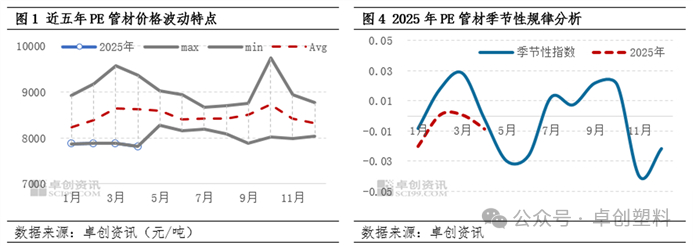 从价格的季节性表现来看,2025年一季度PE管材价格走势符合季节性波动特点,但低于季节性指数,季度内政策端并未给予市场有效支撑,价格运行多围绕供需面展开,虽然上游供应端暂未表现出明显压力,但需求拖累下,价格难走出持续性上涨行情,多维持区间震荡运行,上涨及下跌空间均有限。