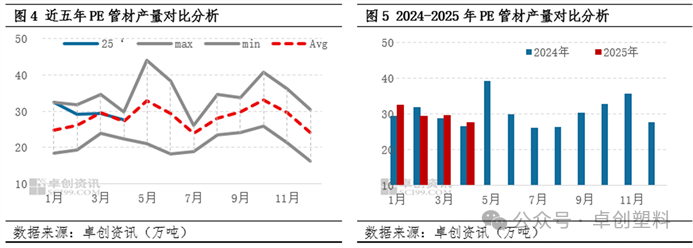 2025年1季度来看,未有新投产PE管材生产企业,多以前期存量排产管材企业产量释放为主,据卓创资讯统计,1季度PE管材产量在91.13万吨,较上一季度跌5.04%,但较去年同期小涨1.4%。1月份处于塑料产品需求淡季,尽管管材需求未见明显好转,但部分生产企业考虑到管材产品累库风险较低,因此春节前后继续维持管材生产,产量持续增加,导致供应压力增大,石化企业和贸易商积极让利出货为主,供应端支撑有所减弱。进入2月份,受1月底低价管材冲击影响,上游管材企业普遍处于亏损状态,因此2月份上游生产企业尤其是中油企业大幅减少对管材的排产,加之1月份管材低价去库顺畅,2月份各环节供应压力不大,市场支撑有所增强。3月份,受华南地区两套装置集中排产管材,整体供应压力增加,尤其对华南市场支撑减弱,但华北和华东地区供应端变动不大,市场底部支撑仍较强,但由于市场去库不畅,供应对市场的支撑也相应减弱。
