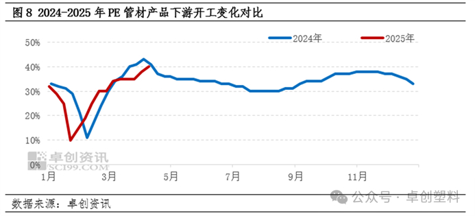需求:根据市场调研,PE管材下游工厂有效订单跟进不足,部分回款周期较长且需要垫资的订单下游工厂接单意愿不高,目前多以维持部分经销订单为主,因此当前小厂订单周期维持时间较短,且后续订单跟进情况并不理想,工厂开工提升有阻力,原料需求仍显不足。中大厂虽然订单相对稳定,但基于对后续需求的谨慎预期,仍以消耗前期低价原料及成品库存为主,终端工程未有进一步跟进下,4月份需求难有进一步改善预期,而进入到5-6月份南方地区逐步进入到雨季,工程类开工预计受限,进一步抑制订单的传导,而北方区域仍需关注到市政基建类开工的进度及地方化债的情况,能否对需求产生进一步的推动。