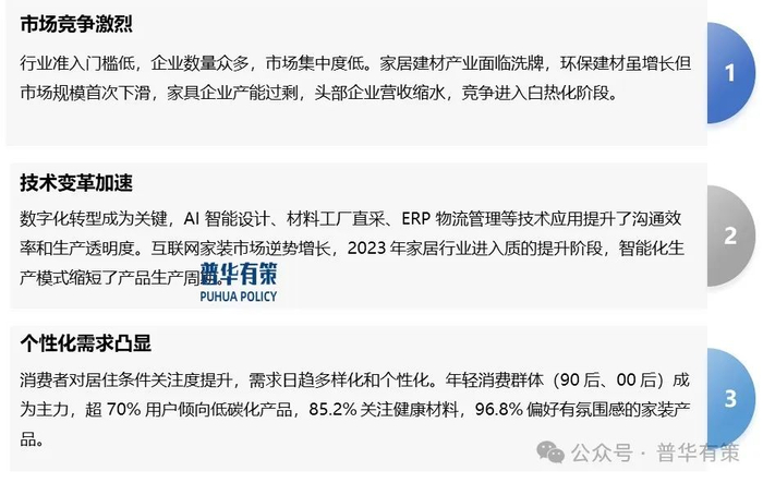 当下家居装饰行业呈现三大显著特征:市场层面,因准入门槛低、企业众多且集中度低,行业竞争激烈,产业面临洗牌,环保建材增长与市场规模下滑并存,家具企业产能过剩、头部企业营收下降;技术领域,数字化转型加速,AI智能设计、工厂直采、ERP物流管理等技术广泛应用,提升沟通与生产效率,互联网家装逆势上扬,智能化生产缩短产品周期;消费端,消费者对居住条件愈发关注,需求多元个性,以90后、00后为代表的年轻群体成为消费主力,低碳、健康、氛围感产品备受青睐。