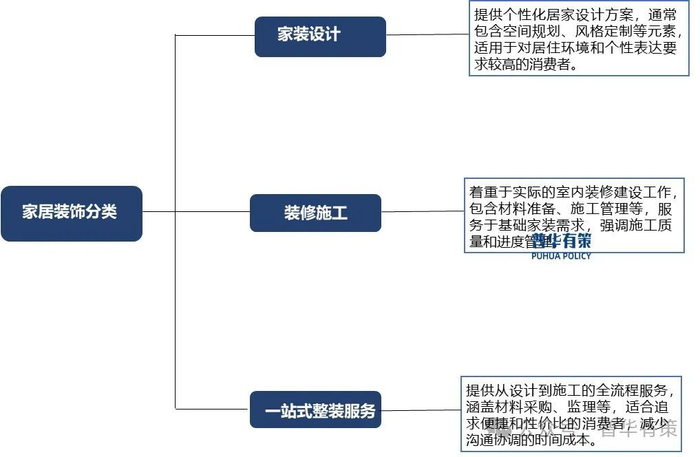 家居装饰行业是指专注于室内空间及其环境设计与美化的行业,旨在基于居住者的审美需求优化居住环境,提升生活质量。该行业贯穿室内设计、装修施工和产品的选购与搭配等多个环节,涵盖家具、照明装置及其他装饰物的应用,遵循特定商业模式,如设计咨询、项目定制、施工装修等服务。近年来,家居装饰行业呈现出多样化和智能化的新趋势,正朝着多功能化与技术集成方向发展。根据服务模式,家居装饰行业可分为以下三类:
