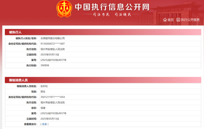 5月30日,记者从中国执行信息公开网获悉,因39.09万元的执行标的,永辉超市及其董事长、法人代表张轩松被限制高消费。