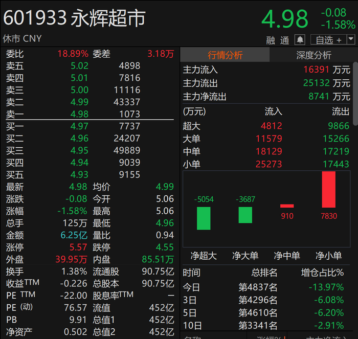 截至5月30日收盘,永辉超市股价跌1.58%,收报4.98元/股,总市值为452亿元。