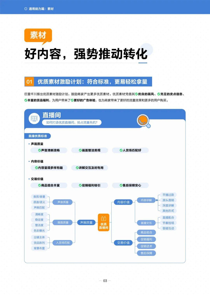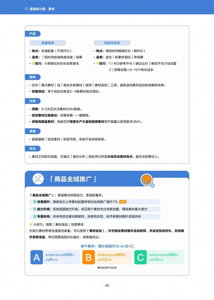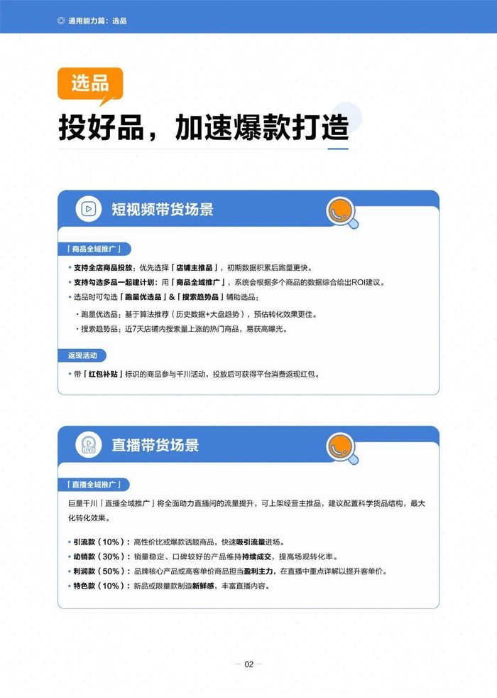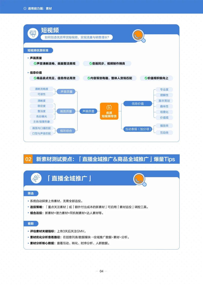 在选品方面,推荐使用“商品全域推广”,优先选择“店铺主推品”,并利用“跑量优选品”和“搜索趋势品”辅助选品。素材制作上,强调优质素材的重要性,推出“优质素材激励计划”,并提供短视频和直播间的优质标准。