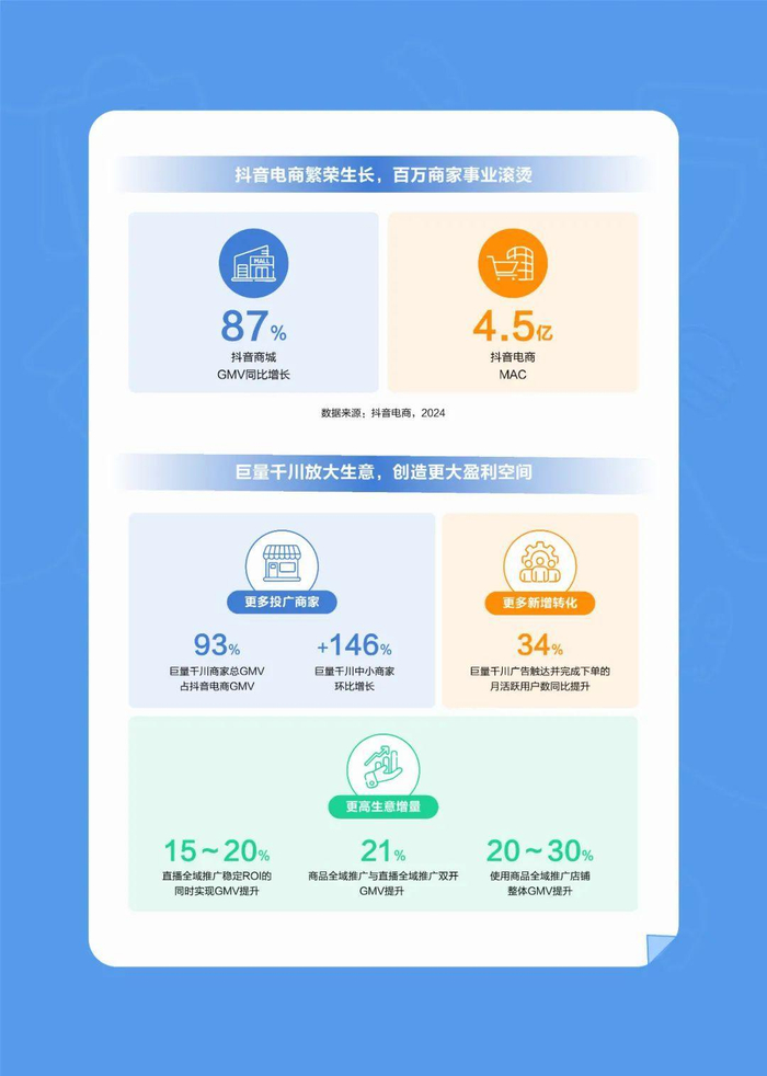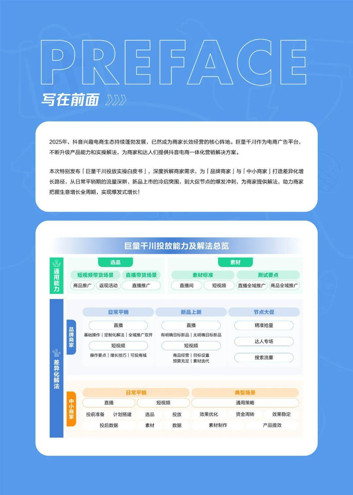 白皮书指出,2025年抖音电商生态持续繁荣,巨量千川作为电商广告平台,不断升级产品能力,为商家提供一体化营销解决方案。白皮书特别针对“品牌商家”与“中小商家”打造差异化增长路径,涵盖日常平销、新品上新、节点大促等全周期投放策略。
