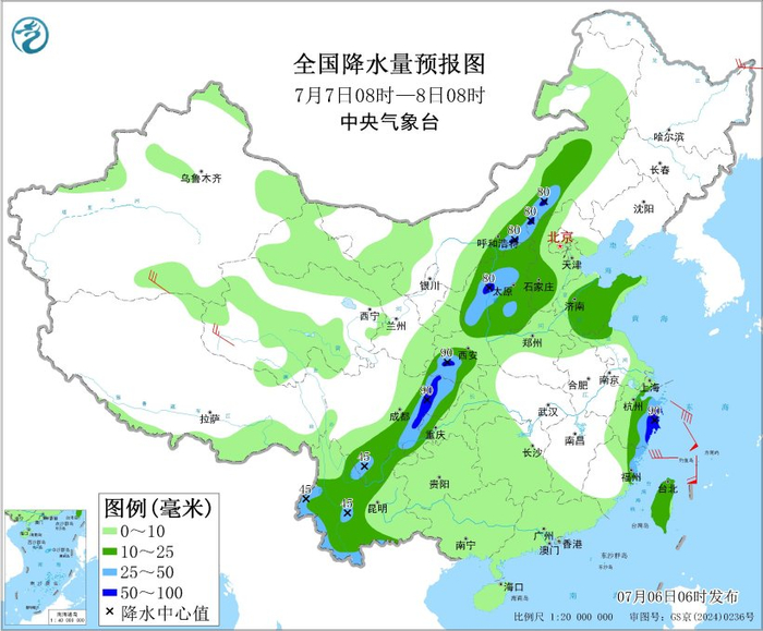 图1 全国强降雨落区预报图(7月6日08时-7日08时)