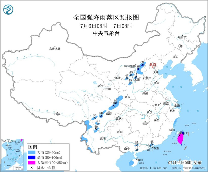 其中,预计,7月6日08时至7日08时,台湾岛、广东西南部、广西东南部、海南岛西部、浙江东南部、福建东北部、内蒙古南部、山西北部、陕西北部和西南部、四川盆地西北部、川西高原南部、云南中西部等地部分地区有大到暴雨,其中,台湾岛中南部有大暴雨(100~230毫米)(见图1)。上述部分地区伴有短时强降水(最大小时降雨量20~50毫米,局地可超过70毫米),局地有雷暴大风等强对流天气。中央气象台7月6日06时继续发布暴雨蓝色预警。
