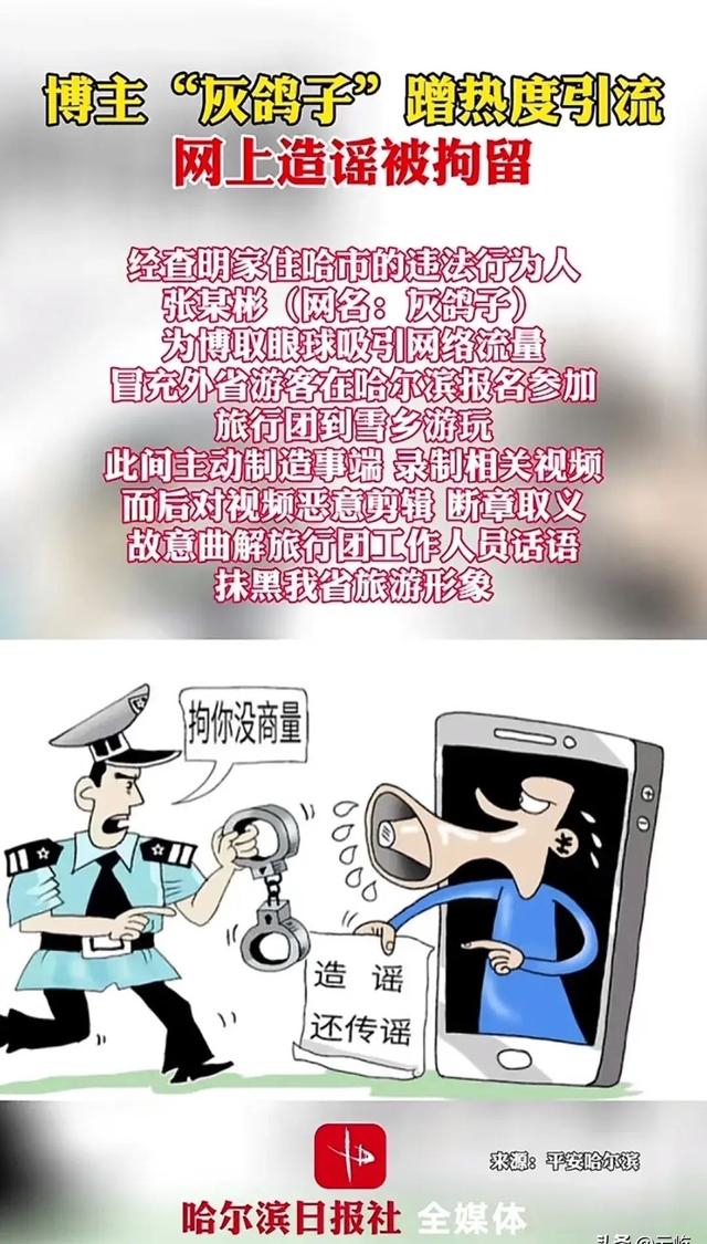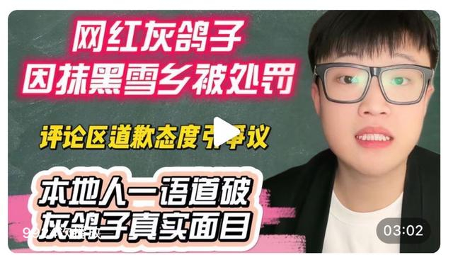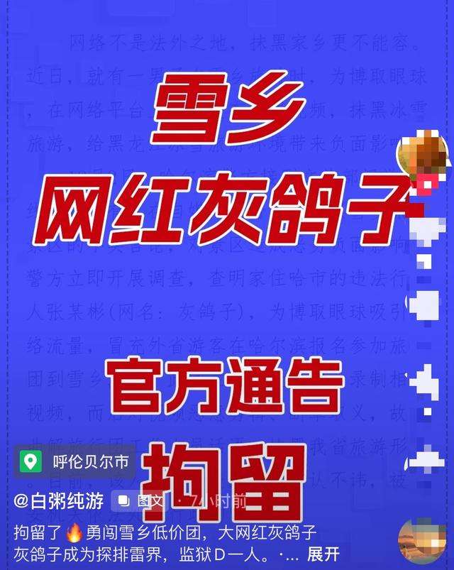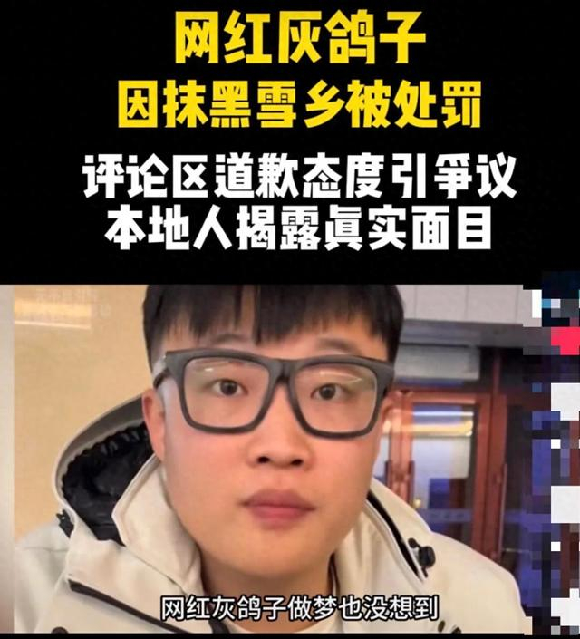 根据旅游热搜榜消息,2023年12月6日《红星新闻》报道:哈尔滨网红灰鸽子视频存在恶意拍摄、恶意剪辑,抹黑家乡,对黑龙江冰雪旅游和雪乡旅游形象造成极坏影响,这些视频镜头都是灰鸽子为了博取流量故意编造,目前灰鸽子因违法被惩罚,当地一份通报,网络不是法外之地,不信谣,不造谣、不传谣,抹黑家乡旅游更不能纵容。
