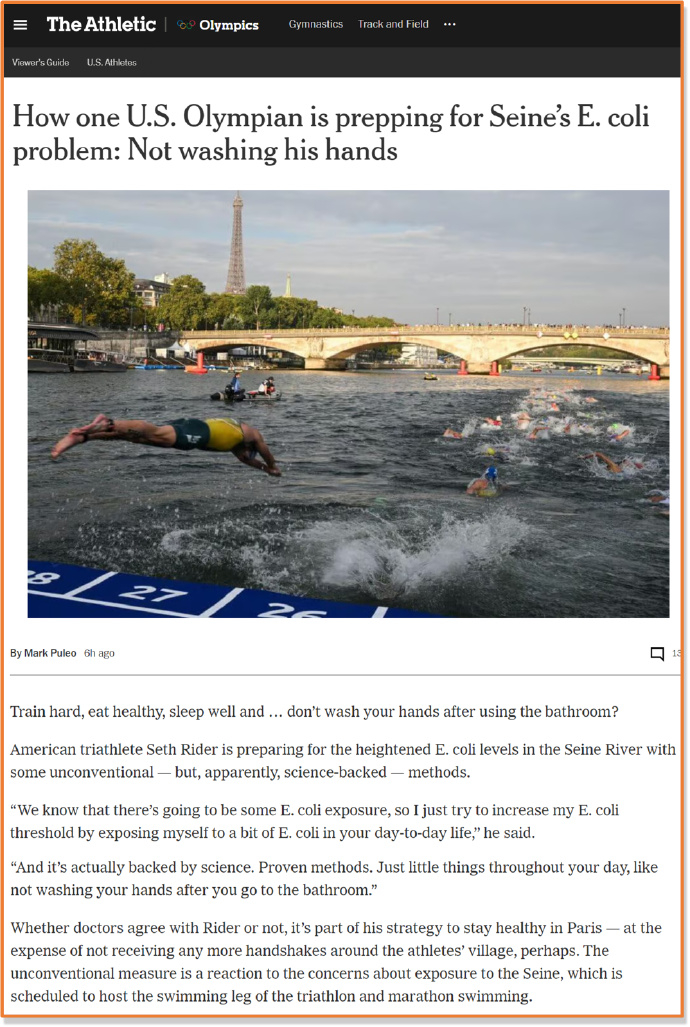 美国运动员赛斯·瑞德针对塞纳河高含量的大肠杆菌做出了针对性训练,譬如日常生活中多接触细菌提前建立耐受,譬如上完厕所不洗手。额,一时间不知道是认真的还是开玩笑。