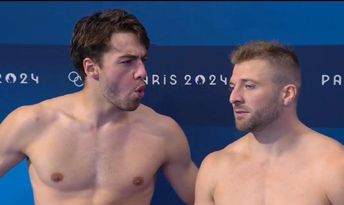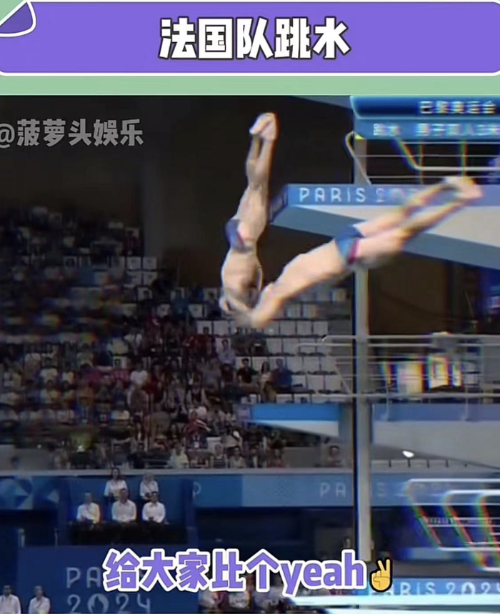 法国跳水运动员可能都继承了这种心态好的气质,在男双10米跳台上两位法国选手各跳各的,侧面看完全不重叠,甚至跟老天爷比了个耶。