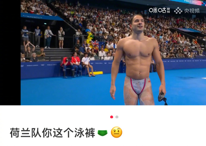 以及荷兰游泳运动员Arno Kamminga仿佛穿了个透明泳裤就来上场了,下水前还好好的,下水后完全变成透视装,网友调侃:像个大闸蟹。