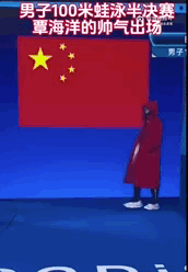 只见我们游泳运动员覃海洋把出场仪式,走成了T台秀,一件红色长款羽绒服加泳镜走出了顶级时装周黑超男模的bking感,帅气硬控导播10秒钟。