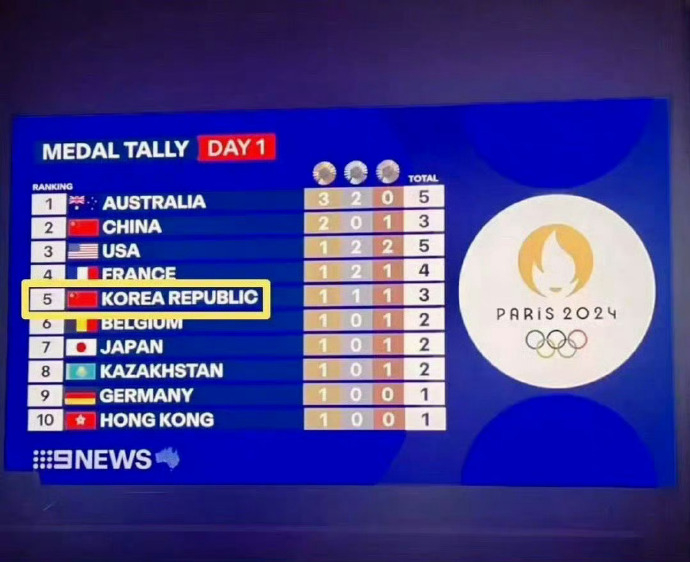 第一天金牌榜排名的时候又把韩国国旗标称了中国国旗。