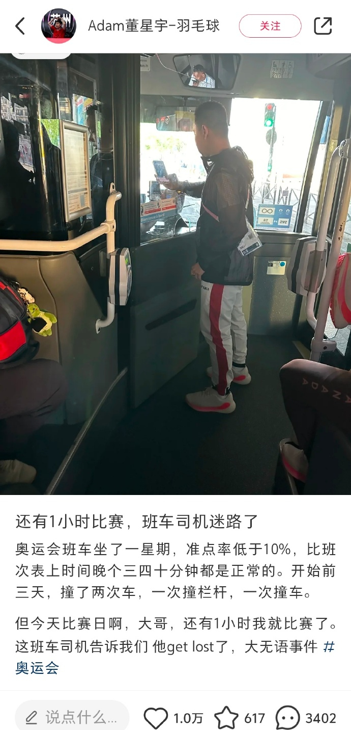 结果我们的羽毛球运动员董星宇发小红书吐槽,奥运巴士准点率低于10%,晚点超过半个钟都算正常,前三天就遇上两次撞车,一次撞栏杆,一次撞车。