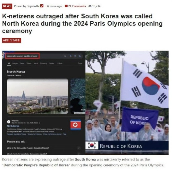 图源:微博 就别说开幕式介绍各国运动员的时候,法国人直接把韩国国名念错了,而且是法文和英文都念错了,一个甚至直接念成了朝鲜,朝鲜表示:怎么,一觉醒来统一了?