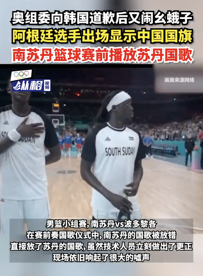 在南苏丹vs波多黎各男篮小组赛赛前奏国歌仪式里,又把南苏丹的国歌错放成了苏丹的国歌。