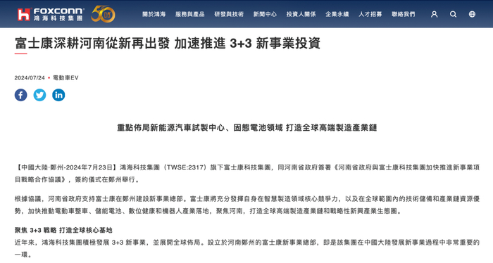 7月24日,富士康母公司鸿海集团在台交所发布公告,宣布与河南省政府签署《加快推进新事业项目战略合作协议》。根据协议,富士康将在郑州投资建设新事业总部大楼,项目一期选址于郑东新区,占地面积7万平方米,总投资达10亿元人民币。