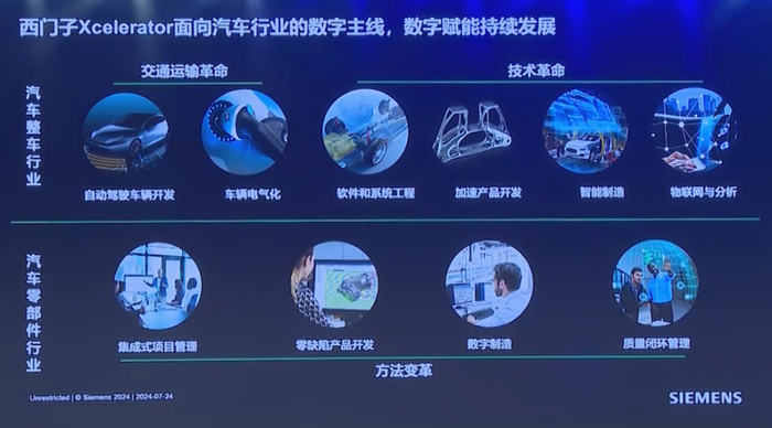 在本次汽车与交通运输行业分会场,来自西门子数字化工业软件的技术专家具体解读了西门子面向汽车整车行业的加速产品开发和智能制造数字主线,以及面向汽车零部件行业的IATF16949全流程精益化数字主线,如何帮助实现可持续发展目标。