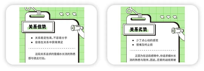 对于你的理想关系类型,我们也列举了关系中可能存在的积极和消极方面,希望能够帮助你在亲密关系中及时自我觉察,从而更好地经营关系。
