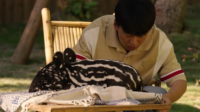 小马来貘大概十五周左右会变毛色,大部分变成背上一个白毯子的,但好像剧里的老马来貘是全黑的不是黑白的?其实马来貘也会有全黑的成年体,而其他四种貘成年都是纯色的,要是剧里捡到的貘是什么更罕见的那就是角色天生好运圣体。