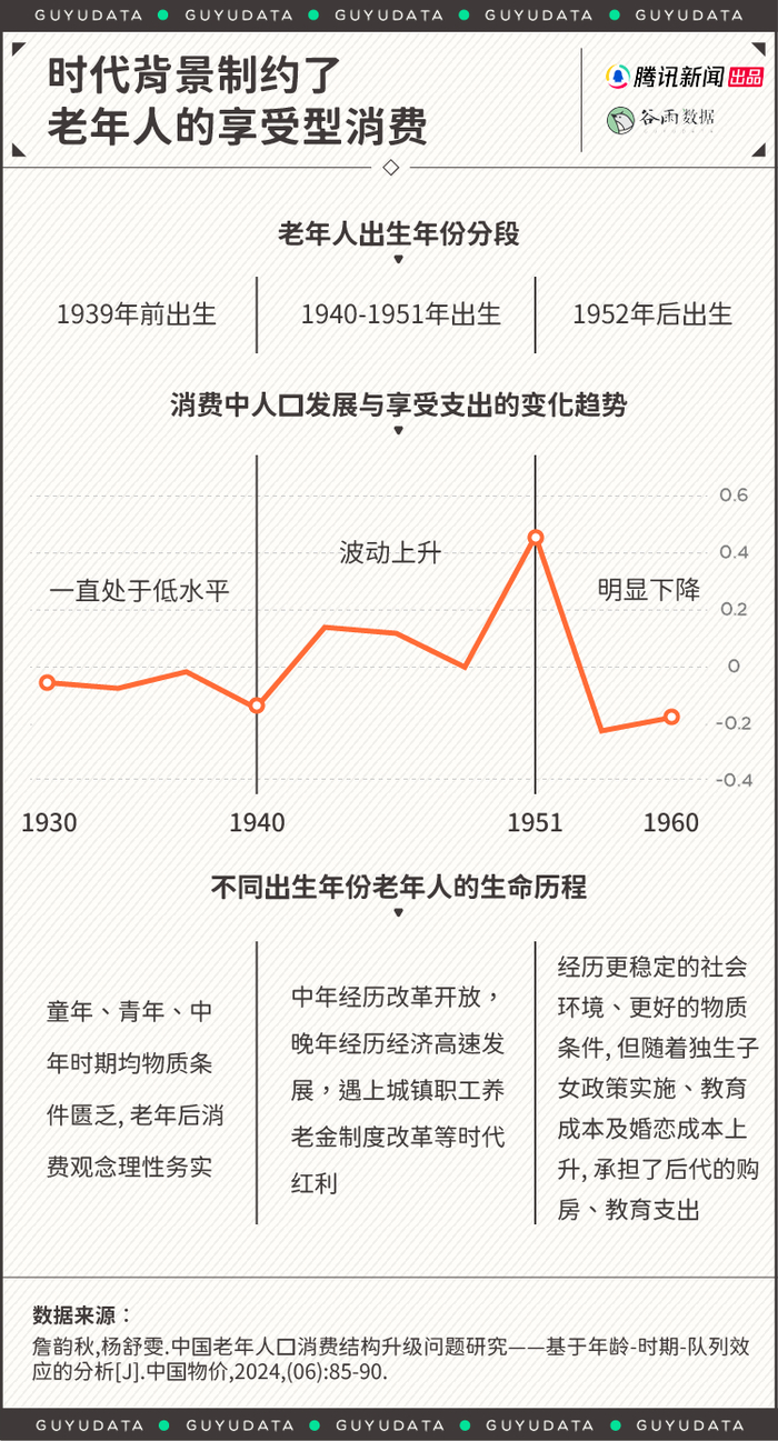 而1952年后出生的老人,虽然有更稳定的社会环境和更好的物质条件, 但普遍承担了后代的购房、教育支出, 形成了“给子女减负”“为子女奉献”的观念,整体消费水平甚至低于更早出生的老人。