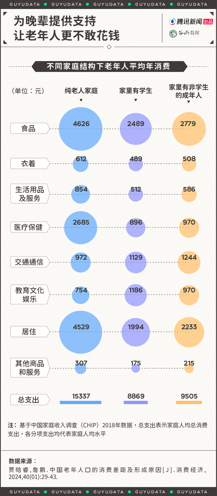 另一份基于中国家庭收入调查(CHIP)的研究发现,纯老年人家庭,每个老人平均每年为自己花1.5万多元,其中4600多元花在饮食上。而家里有学生的老年人,消费会比纯老人家庭降低42.17%,用在自己吃喝上的钱只剩下2400多元,分摊到每个月仅200元。