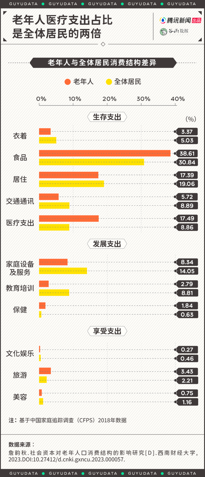 根据北京大学中国家庭追踪调查(CFPS),60岁及以上老年人的消费结构中,食品和医疗支出两项明显超出全体居民,其中医疗支出几乎是全体居民的两倍。